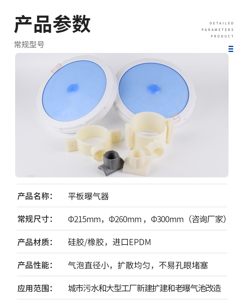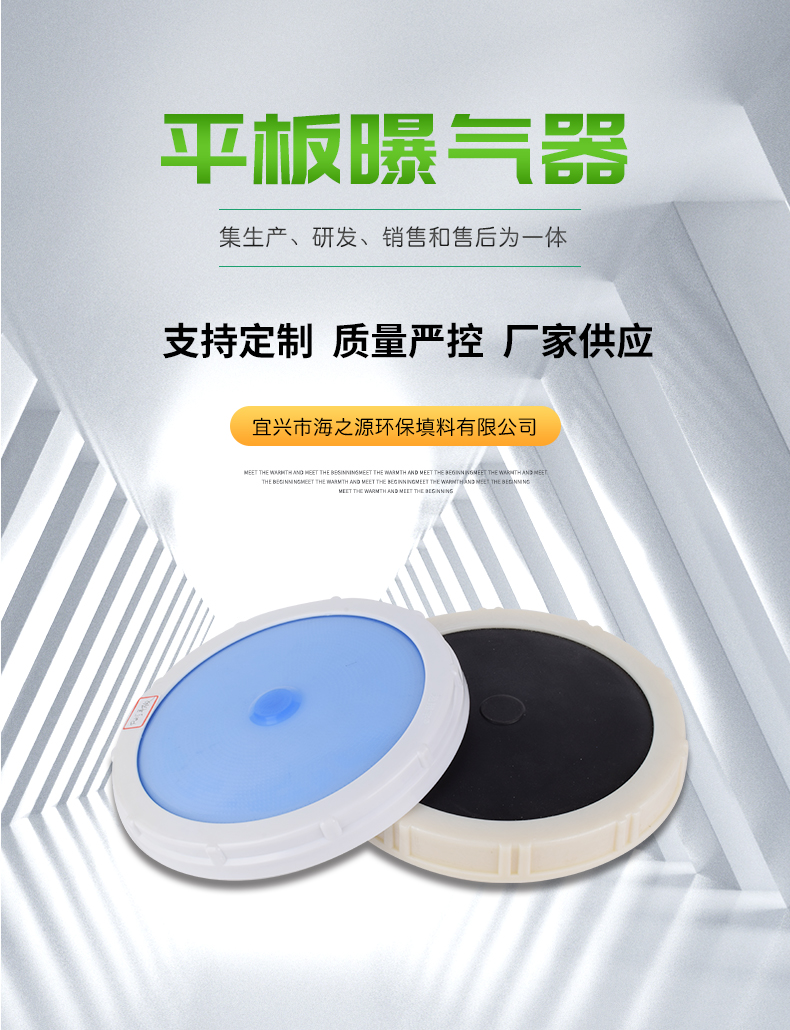 平板膜片曝氣器,該裝置曝氣氣泡直徑小,氣液界面直徑小,氣液界面積大,氣泡擴(kuò)散均勻,不會(huì)產(chǎn)生孔眼堵塞,耐腐蝕性強(qiáng),經(jīng)上海同濟(jì)大學(xué)環(huán)境工程學(xué)院和中國市政工程華北設(shè)計(jì)院進(jìn)行清水和污水充氧測試,并經(jīng)50多家用戶多年使用效果良好(比常規(guī)產(chǎn)品固定螺旋曝氣器,散流曝氣器和穿孔管曝氣器能耗降低40%,或增加污水處理量40%)。特別適用于城市污水和大型工廠新建擴(kuò)建和老曝氣池改造,且曝氣池可間歇運(yùn)行。