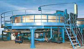 我廠自行設計研制的QF型高效淺池氣浮裝置針對傳統氣浮設備的不足之處,把原水進口、凈化水出口設計為移動式,分離過程為靜態,以縮短源水腫的氣泡上浮時間,池子中水的流態基本上相對靜止。原水中的懸浮物從池底浮到表面的速度快(可達40-100MM/MIN),水深只需400-500MM就可以了,也就是說停留時間3-5分鐘,原水達到凈化要求。為了使進、出口能同步轉動,該機設計成圓形。