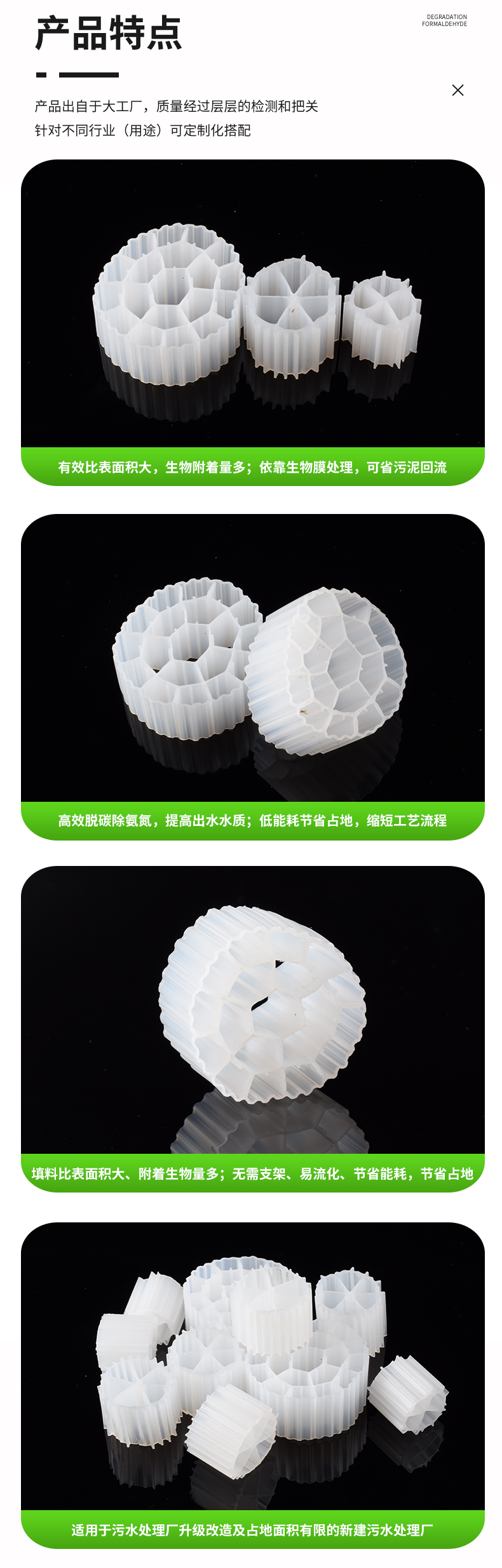 好氧生物流化床工藝中采用立體空心填料為好氧生物載體,填料為中空結構,正常運行進,填料懸浮在水中。填料內部生長厭氧茵,產生反硝化作用可以脫氮;外部生長好氧茵,去除有機物,整個處理過程中同時存在硝化與反硝化過程。