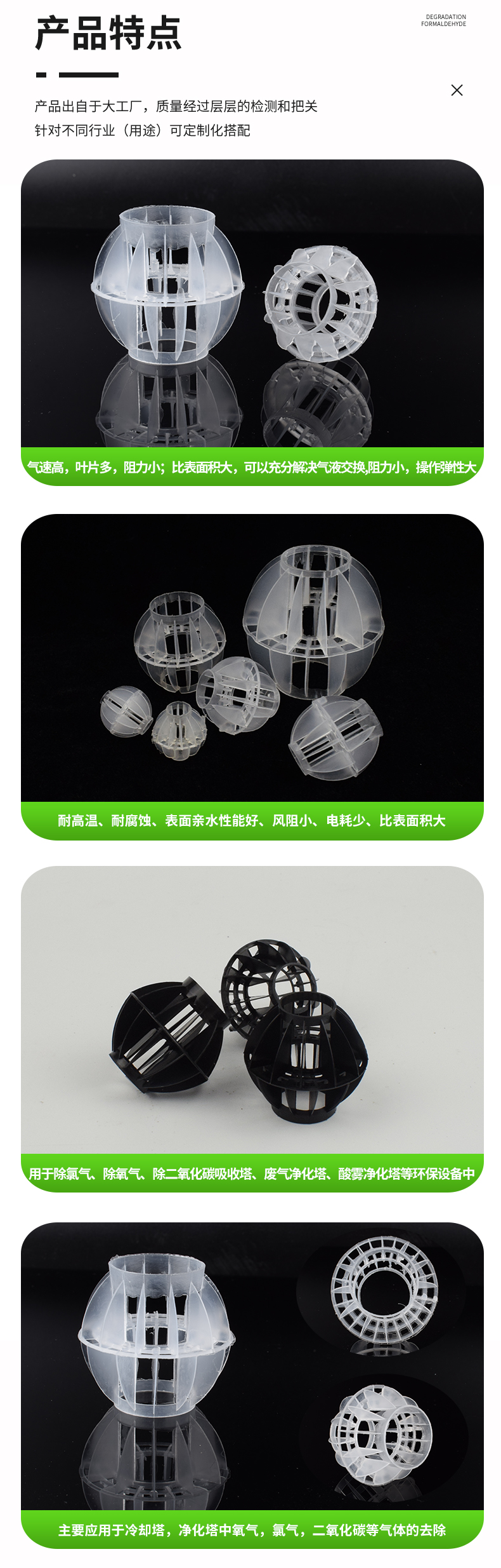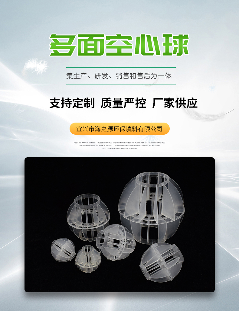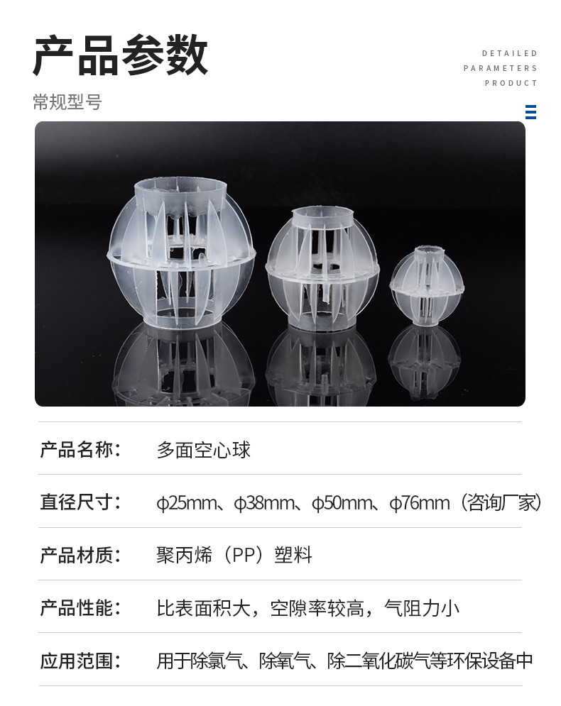 采用聚丙烯(PP)塑料制成球狀,由兩個半球合成一個球形,每個半球上根據設計需要有8-12個半扇形葉片,兩個半球的扇形葉片相互錯開。該填料特點是比表面積大,空隙率較高。但是由于葉片數偏多,彼此間有遮蔽效應,不利于液體分布和潤濕;液體大多在球體空心柱聚集,阻礙氣體暢通,因此阻力較大。外觀成球形,主要規格有φ25mm、φ38mm、φ50mm、φ76mm、φ100mm。