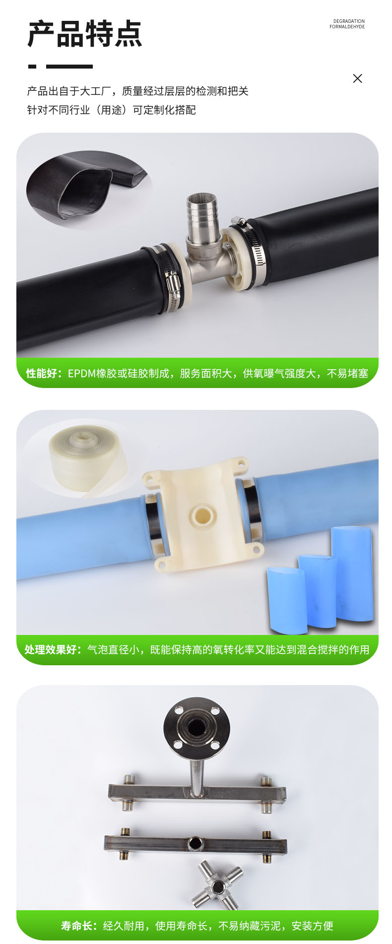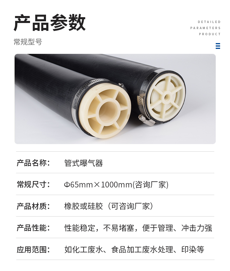 管式曝氣器構造:曝氣膜片、支撐管、空氣管道。管式曝氣器外徑69mm,常規為580mm、800mm和1000mm。長度在580mm一下采用擠出或模壓成型,長度大于580mm采用擠出成型。膜管上一1.5mm大小、2×2.5mm的間距打孔,能產生直徑1-3mm的均勻微小氣泡膜管頂部有15mm長無氣孔區,當終斷供氣時膜片立即恢復原狀。對空氣入口起自動防逆流作用。