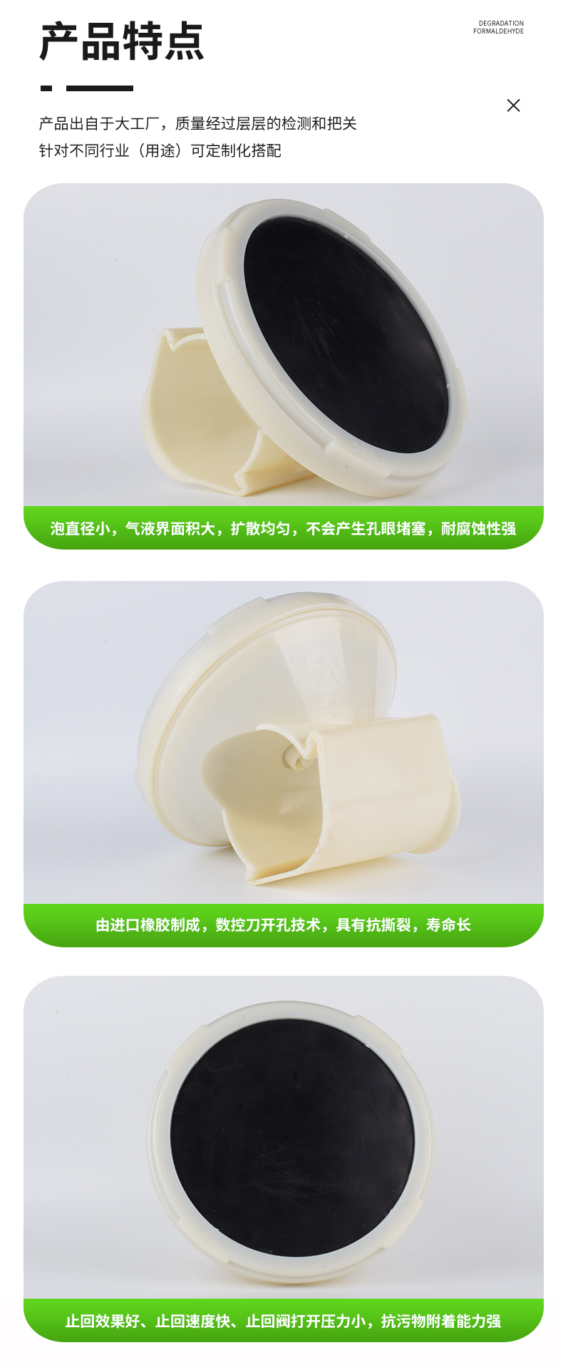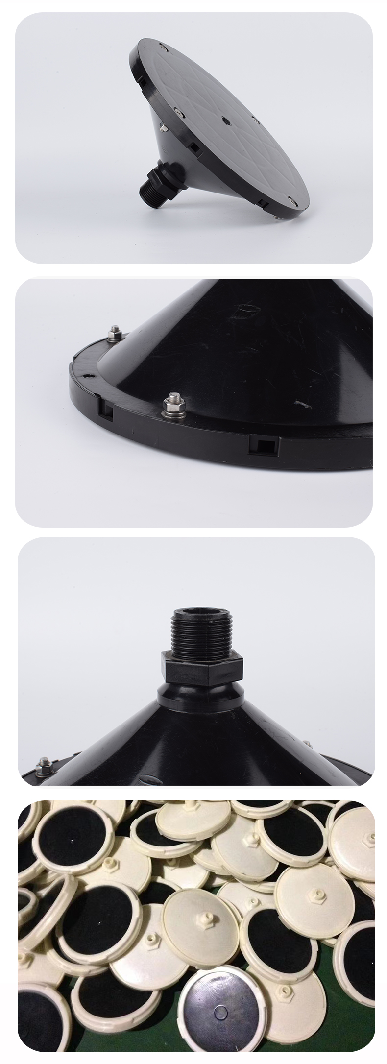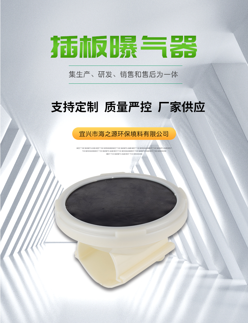 插板曝氣器由底盤(pán)、布?xì)獗P(pán)、合成橡膠膜片、壓固圓環(huán)、空氣導(dǎo)流板、連接底座與配氣管連接的連接件組成。底座由ABS塑料制成,底座與壓固圓環(huán)上均有螺紋,EPDM橡膠膜片覆蓋在空氣均流板上,在固定圈的作用下能保證在膜片(周圍不漏氣,橡膠膜片在有均勻分布的孔眼,該種橡膠膜片采用多道特殊工藝加工而成,其性能穩(wěn)定,耐中濃度酸、堿、油等介質(zhì)。