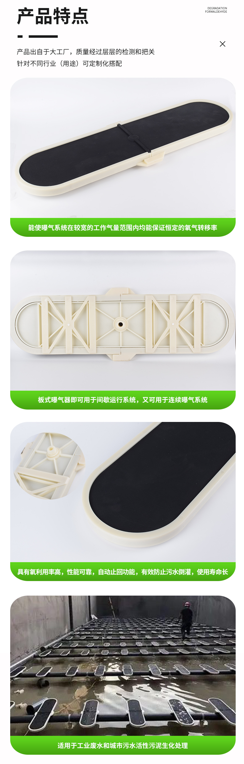 板式曝氣器設(shè)計結(jié)構(gòu)使曝氣器系統(tǒng)在較寬的工作氣量范圍內(nèi)保持低能耗、高效率;開孔方式,在鼓風機工作的過程中,曝氣器產(chǎn)生的氣泡均勻,達到很好的蓮花效應(yīng);該曝氣即可用于間歇運行系統(tǒng),又可用于連續(xù)曝氣系統(tǒng),具有氧利用率高,性能可靠,曝氣器具有自動止回功能,有效防止污水倒灌,使用壽命長等特點。