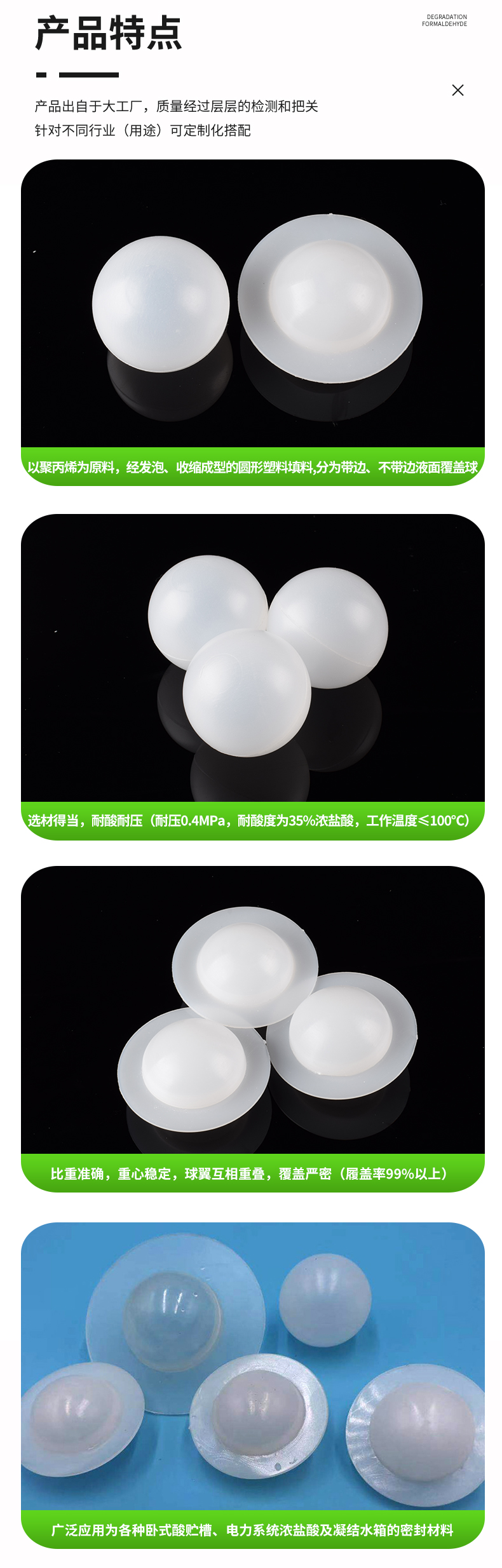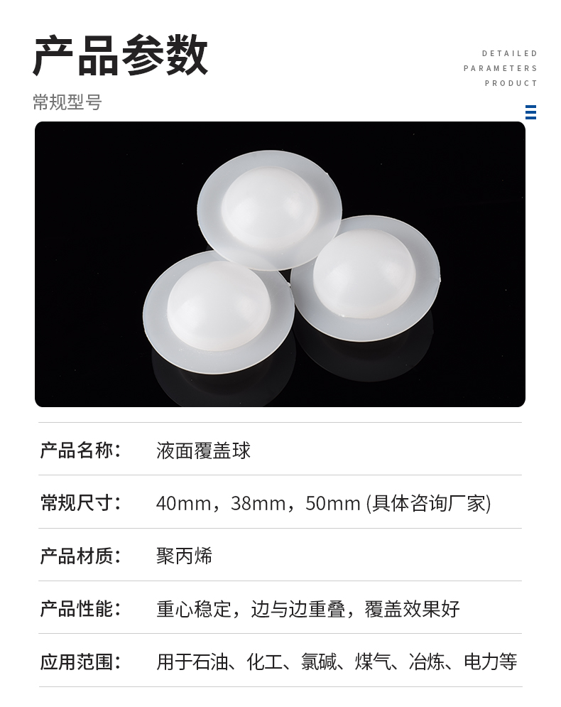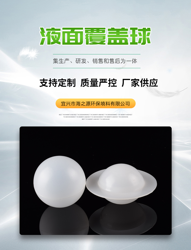 液位蓋球的灌裝產品有兩種:一型為發泡球,二型為發泡實心球(節能球),適用于水處理中的各種臥式酸儲罐、冷凝液儲罐、軟化水儲罐,大大減少酸霧空氣中的一氧化碳和氧氣對水質的污染,保護水質,節能凈化環境。