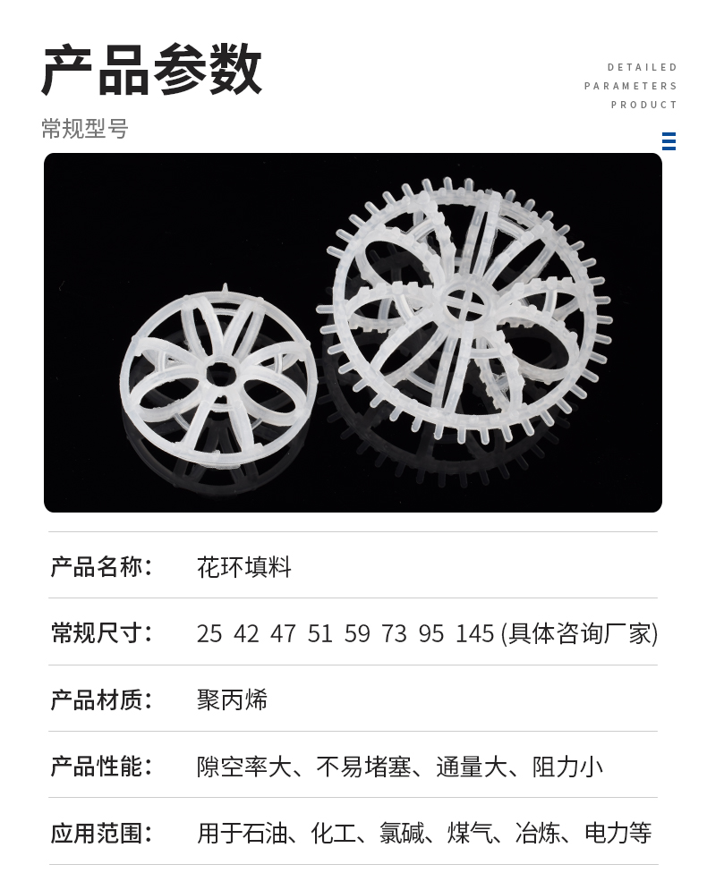 花環填料也稱梅花環填料是由許多圓環結繞而成,由于這種填料的間隙處能有較高的滯液量,可使塔內液體停留時間較長,從而增加了氣液的接觸時間,提高了填料的傳質效率。具有空隙率大,壓降和傳質單元高度低,泛點高,汽液接觸充分,比重小,傳質效率高等特點,多用于氣體洗滌、凈化塔中。
